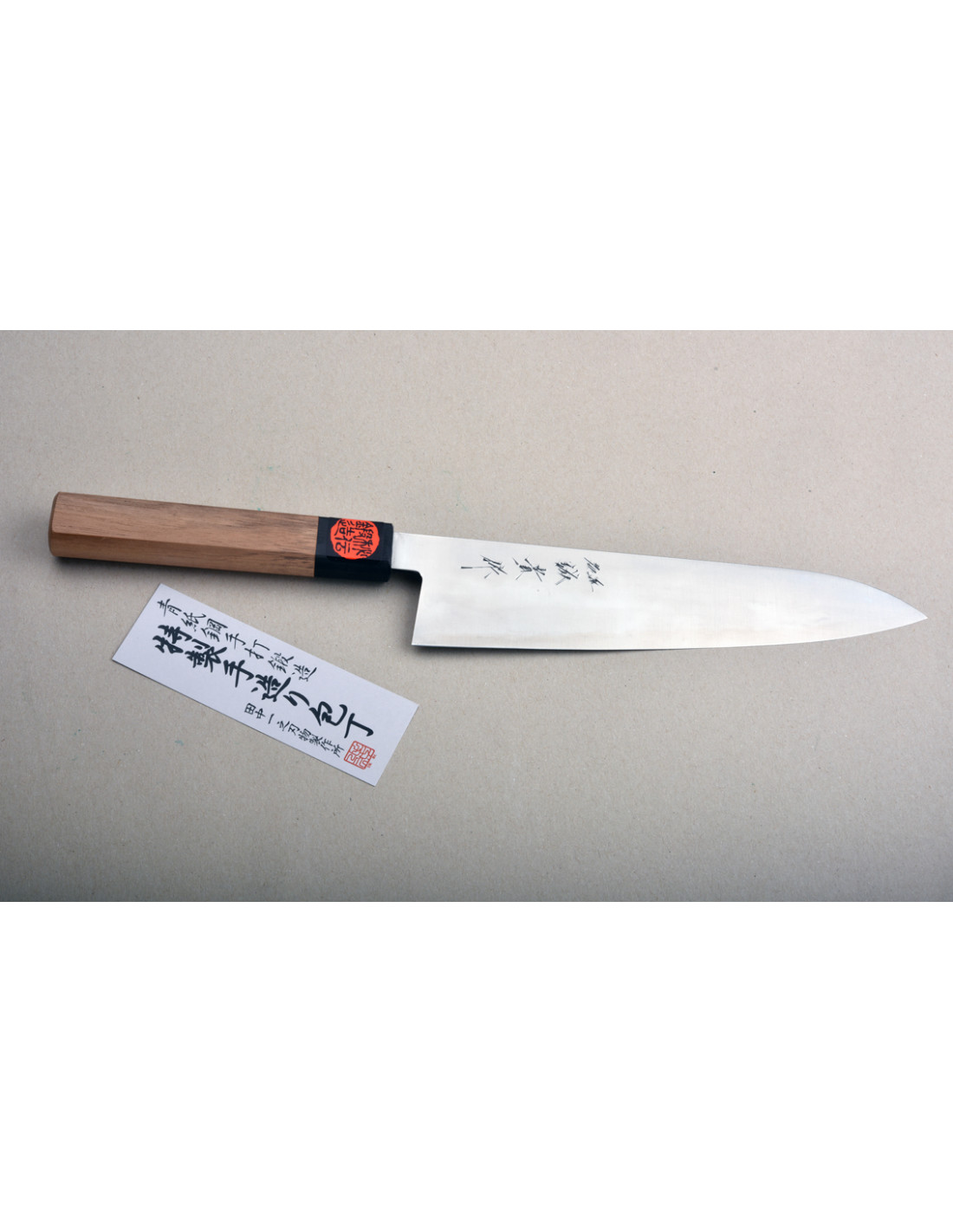 Gyuto par  Shigeki Tanaka lame de  210 mm en sanmai acier doux (non inox) et coeur en Aogami. Du véritable traditionnel !