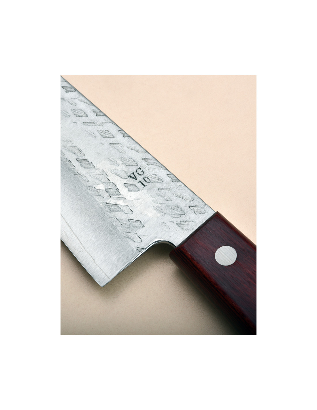 Lame martelée en sanmai inox à coeur VG10 de 210 x 45 mm.