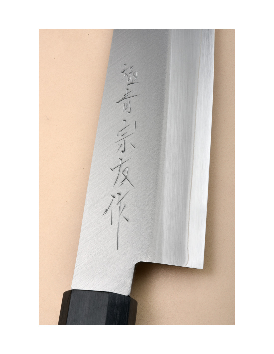 Miki Hamono : Kogaiji Masamitsu - Gyuto sanmai acier doux inox/aogami super 180 mm par Mune Tomo san