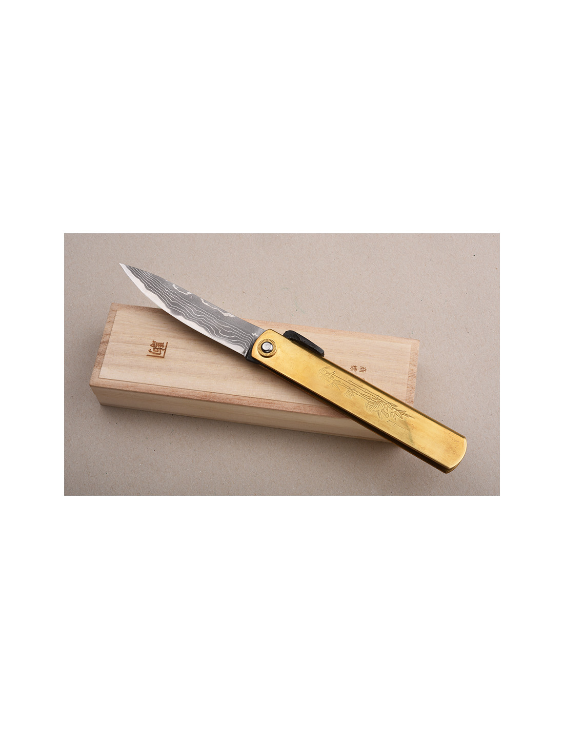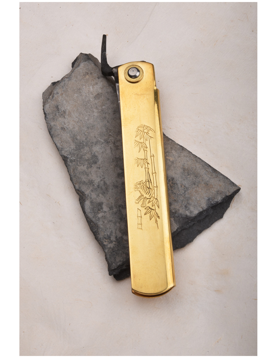 Higonokami Nagao - Manche laiton "Tiger & Bamboo", lame Suminagashi/damas - Manche 120mm